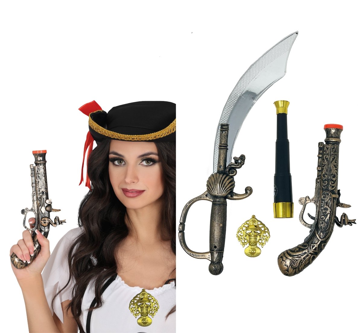 Begib dich auf ein Abenteuer wie ein echter Pirat mit diesem 4-teiligen Fake-Waffenset. Komplett mit Waffe, Messer, Fernrohr und Medaille - alles, was du brauchst, um bei Kostümpartys oder Rollenspielen die sieben Meere zu erobern.