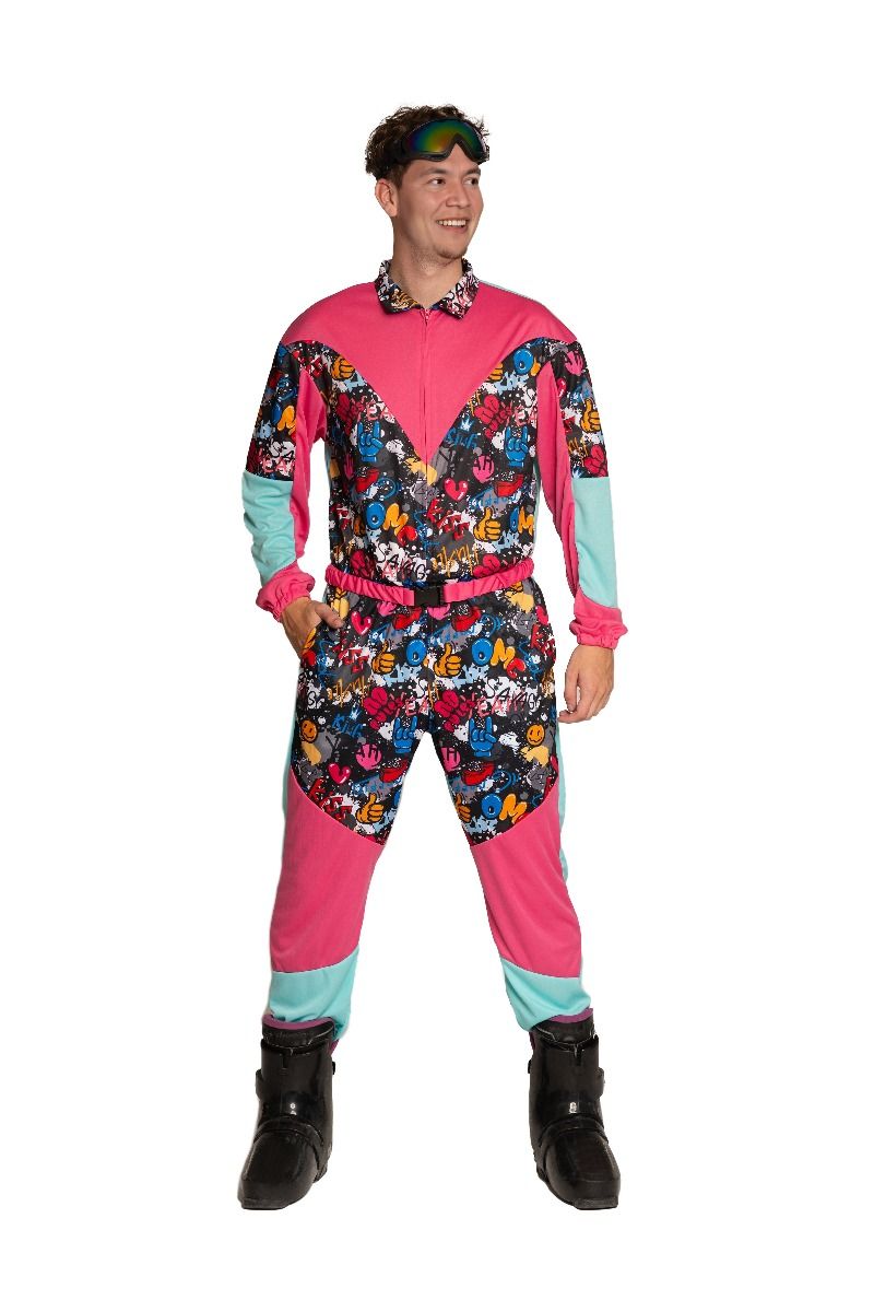 Erwecke den bunten und verspielten Stil der 80er Jahre zum Leben mit diesem 80er Skianzug mit passender Brille. Er eignet sich perfekt für Mottopartys, Faschingsfeste, Karneval oder Festivals. Das auffällige mehrfarbige Design und das leichte Polyestermaterial sorgen für einen authentischen Retro-Look und angenehmen Tragekomfort.
