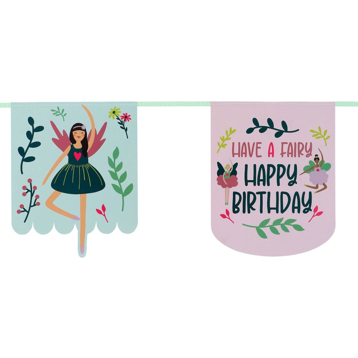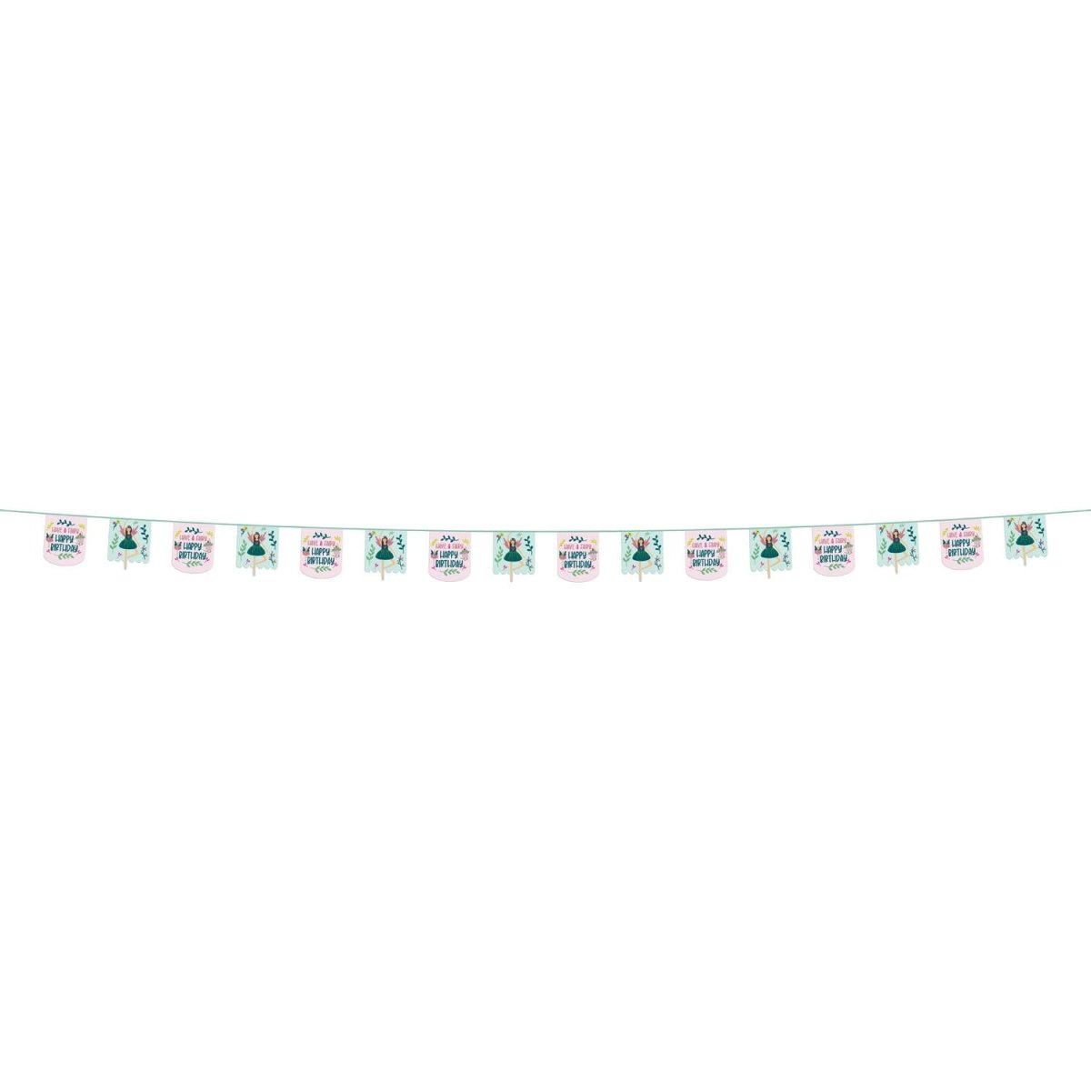 Es ist Feenparty! Fahnenleine - Fabulous Fairy - 6 Meter. Inhalt: 1 Fahnenleine. Kann zum Beispiel bei folgenden Partys/Partyanlässen verwendet werden: Kinderparty, Geburtstag. Auf dieser 6 Meter langen Flaggenleine befinden sich 16 Flaggen mit einer Größe von etwa 17 x 21 cm. Es gibt 3 Arten von Fahnen: eine helltürkisfarbene Fahne mit Wellenrand, auf der eine Fee mit orangefarbenen Haaren und grünen Blättern zu sehen ist, eine ähnliche Fahne, aber mit einer Fee mit braunen Haaren darauf, und eine zartrosa Fahne mit abgerundeten Ecken, auf der der Text "HAVE A FAIRY HAPPY BIRTH DAY" steht und die von Feen und grünen Blättern umgeben ist. Die Fahnen sind auf beiden Seiten bedruckt. Diese Fahnenlinie gehört zu der Fabulous Fairy Kollektion von