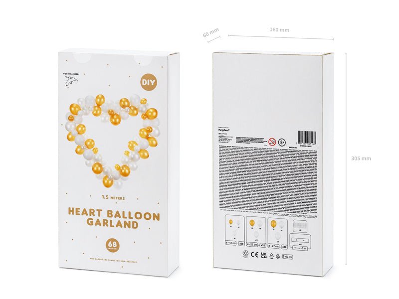 Weiße und goldene Ballongirlande mit Rahmen Herz, Set enthält 68 Ballons (22 in der Farbe Pastell Reinweiß, 23 in der Farbe Metallic Reinweiß, 23 in der Farbe Metallic Gold), 16 Kartonelemente, 20 doppelseitige Klebesticker, Anleitung. Größe nach dem Falten ca. 166 x 160 cm.