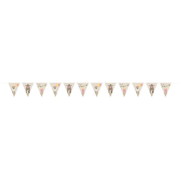 Dieses farbenfrohe Banner ist die perfekte Hängedekoration für eine Party zum Thema Bauernhof. Auf den dreieckigen Wimpeln sind fröhliche Bauernhoftiere wie Schafe und Kühe abgebildet, die mit Partyhüten und Luftballons in der Hand definitiv bereit für eine Party sind!