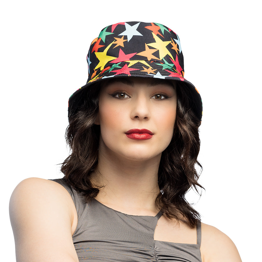 Vervollständige dein Outfit mit dem auffälligen Bucket Hat Stars. Das Retro-Angelhut-Design kombiniert mit dem bunten Sternenmuster macht jedes Party-Outfit zu einem echten Hingucker. Perfekt für Festivals, Strandpartys, freche Partys, Karneval oder eine 90er Jahre Mottoparty.