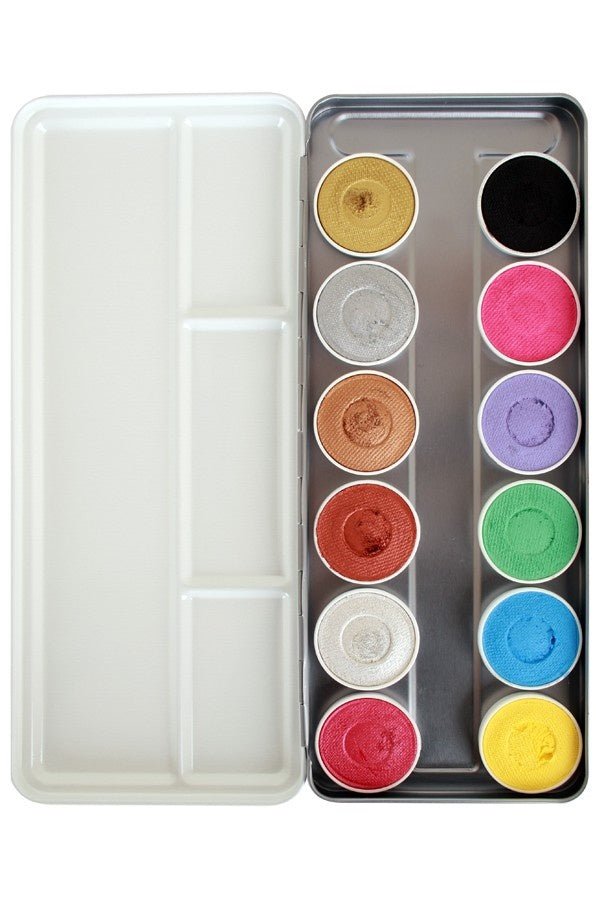 Die Superstar Shimmer and Pastel Schminkpalette enthält 12 wunderschöne, hochwertige Wasserschminkfarben, die den strengen Anforderungen der europäischen Kosmetikgesetzgebung (1223/2009/EC) entsprechen.
