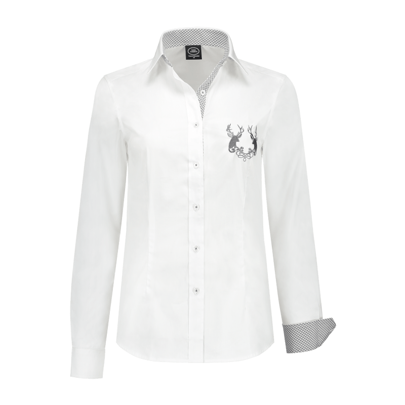 Damenbluse weiß, grauer Karo, Hirsch-Stickerei auf der Brust