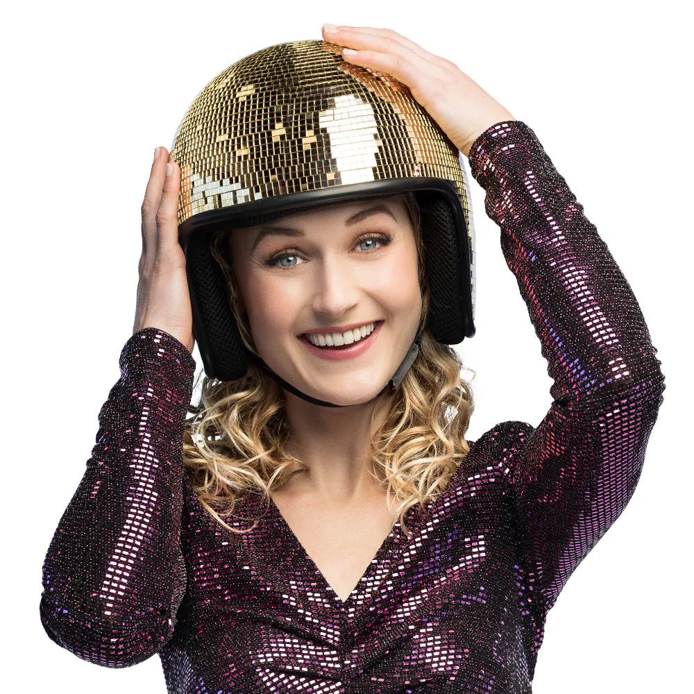Beeindrucke jede Party mit diesem auffälligen goldenen Discohelm. Ideal für Fummelpartys, 70er/80er-Jahre-Mottopartys oder Karneval! Die funkelnden goldenen Spiegel verleihen deinem Outfit einen sofortigen Party-Look. Dank des verstellbaren Riemens bleibt der Helm auch bei den wildesten Tanzbewegungen fest an seinem Platz.