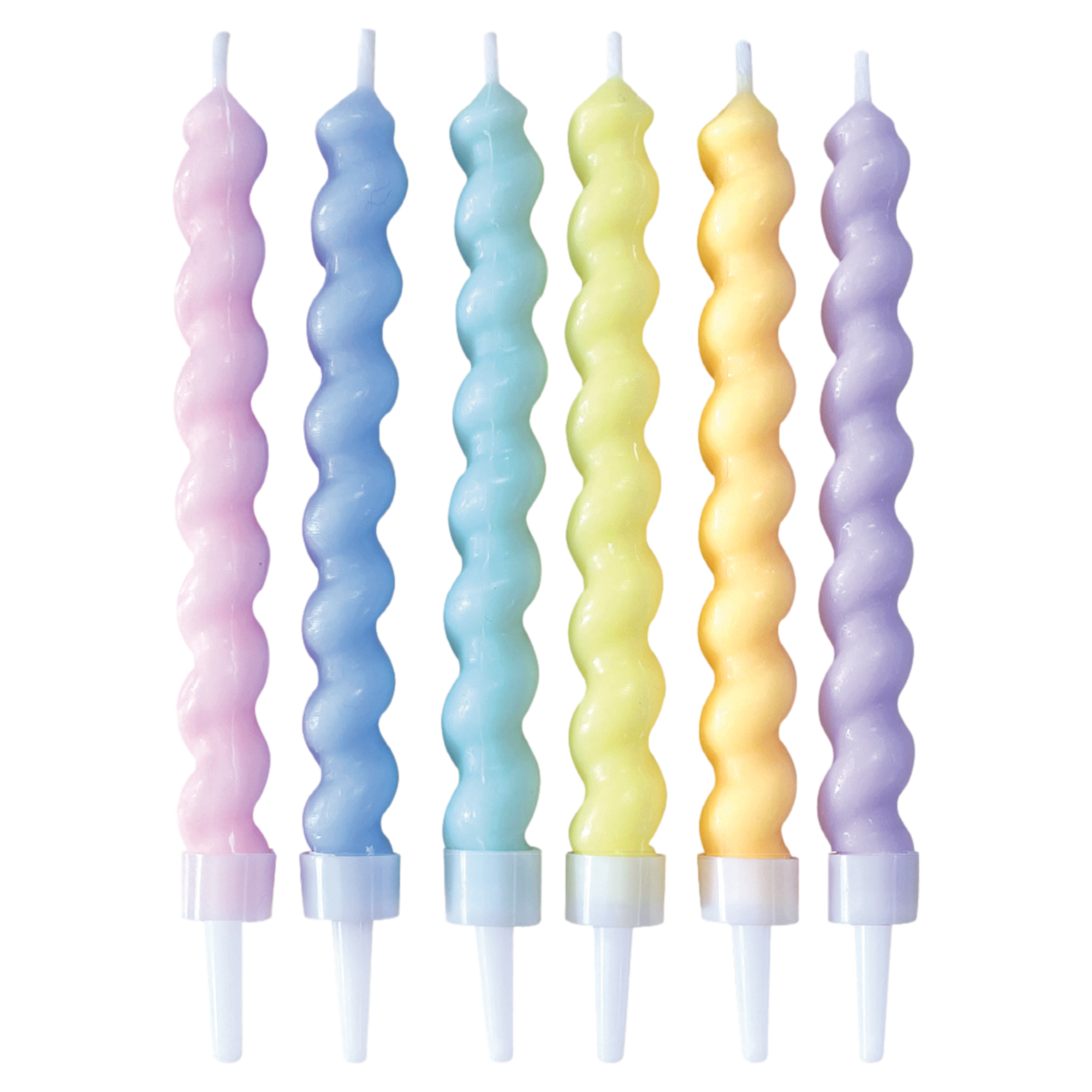 Mit diesem Set aus sechs bunten, gedrehten Pastellkerzen wird jede Party zu etwas ganz Besonderem. Die elegante gedrehte Form und die zarten Pastellfarben verleihen jeder Torte einen festlichen und stilvollen Look. Die Kerzen sind aus Wachs und können so sicher auf der Torte platziert werden. Perfekt für Geburtstage, Jubiläen oder andere festliche Anlässe. Die Packung enthält 6 gedrehte Pastellkerzen aus Wachs.