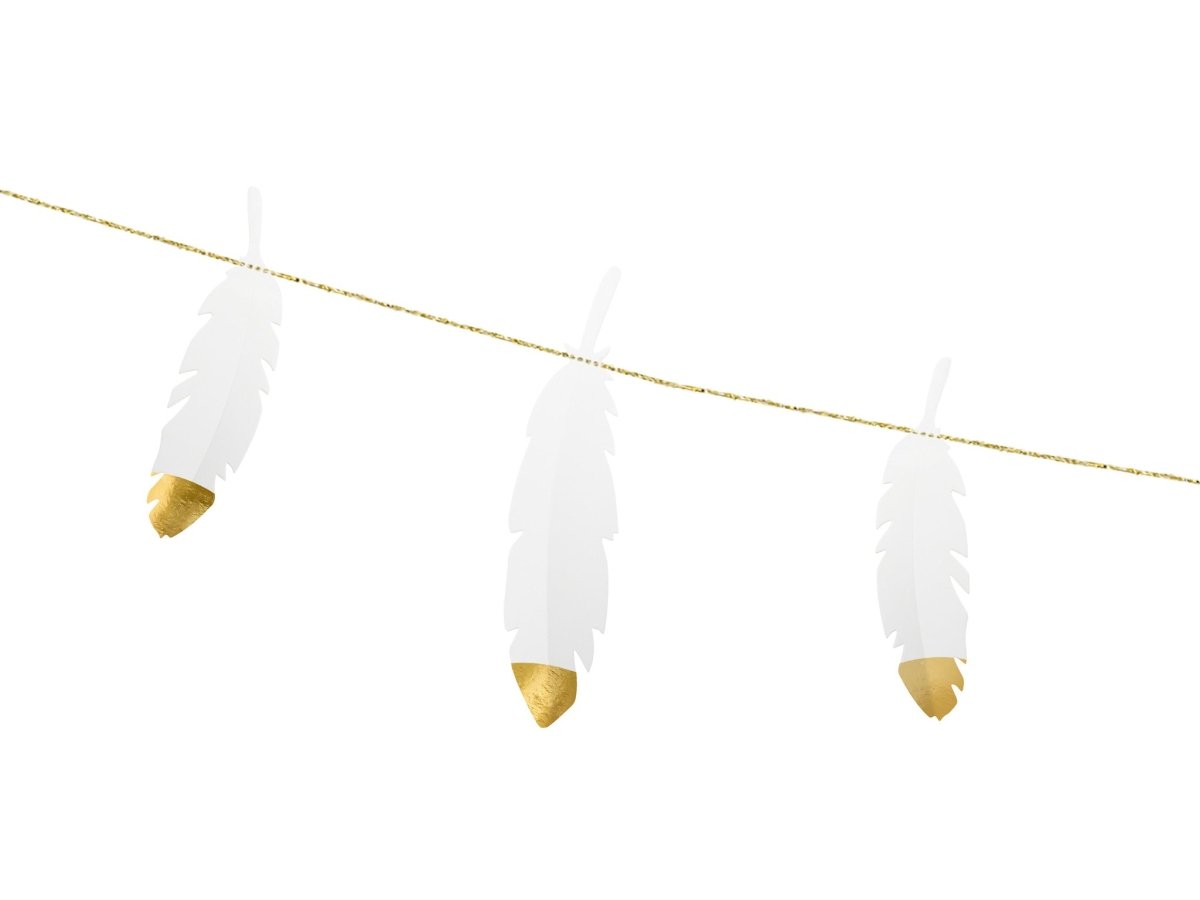Inhalt: genähte Girlande Federn, weiß mit goldmetallischen Enden, Größe: Höhe ca. 13,5 cm, Länge ca. 1,6 m.
