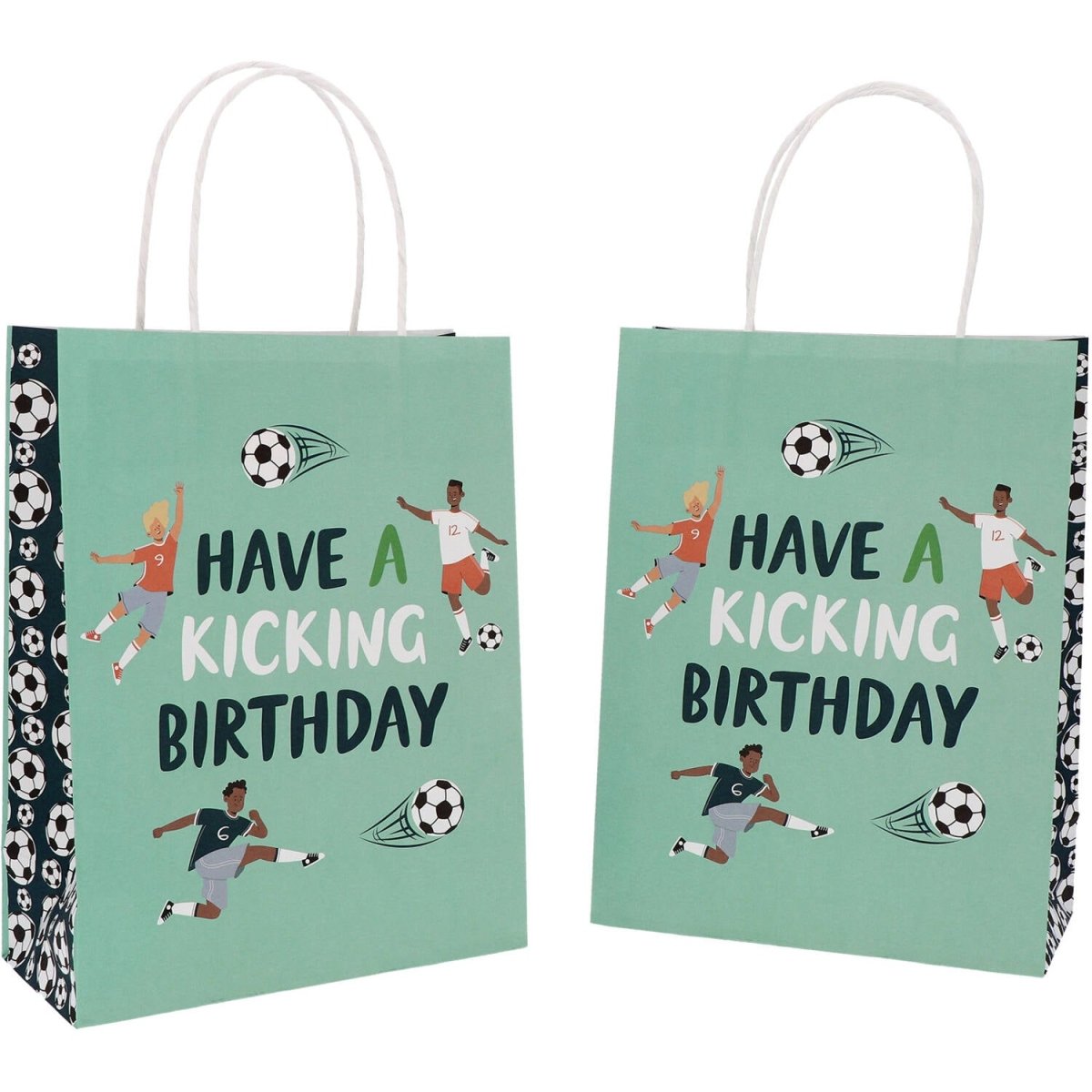 Ein Geschenk für alle Fußballer. Geschenktüten - Fantastic Football - 20 x 27 cm - 6 Stück. Inhalt: 6 Geschenktüten. Zum Beispiel zur Verwendung bei folgenden Anlässen: Kinderparty, Geburtstag. Fröhliche Geschenktüten mit den Maßen 20 x 27 x 10 cm. Sie sind blau und auf beiden Seiten mit dem Text "HAVE A KICKING BIRTHDAY" und drei Fußballern bedruckt, die Seiten sind mit Fußbällen bedruckt. Inklusive Henkel sind die Tüten etwa 37 cm hoch. Diese Geschenktüten gehören zu der Fantastic Football Kollektion von