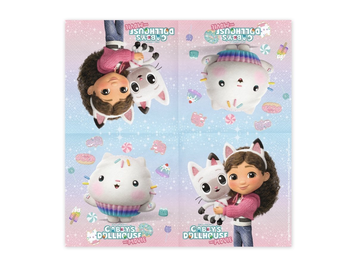 Die Servietten messen ungefaltet ca. 33 x 33 cm und gefaltet ca. 16,5 x 16,5 cm. Perfekt für Kinderpartys und Mottopartys rund um Gabbys Puppenhaus.