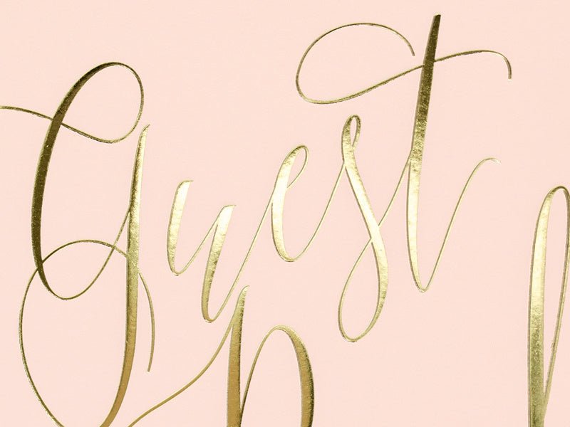 Gästebuch gebunden in puderrosa Papier mit goldener Beschriftung, Größe ca. 20 x 24,5 cm 22 Seiten, ohne Text.