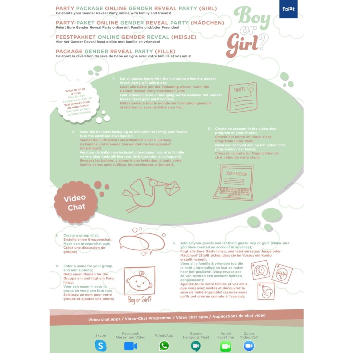 Inhalt: 6 Umschläge und Einladungen mit Erklärung für die Eingeladenen, 3 Gender Reveal Ballons mit rosa Konfetti, Cake Toppers, 1 Flagline, 1 Set mit Folienballons BABY, 1 Wabenfächer, 1 Pompon und 12 beschreibbare Ballons (davon 6 rosa und 6 blau).