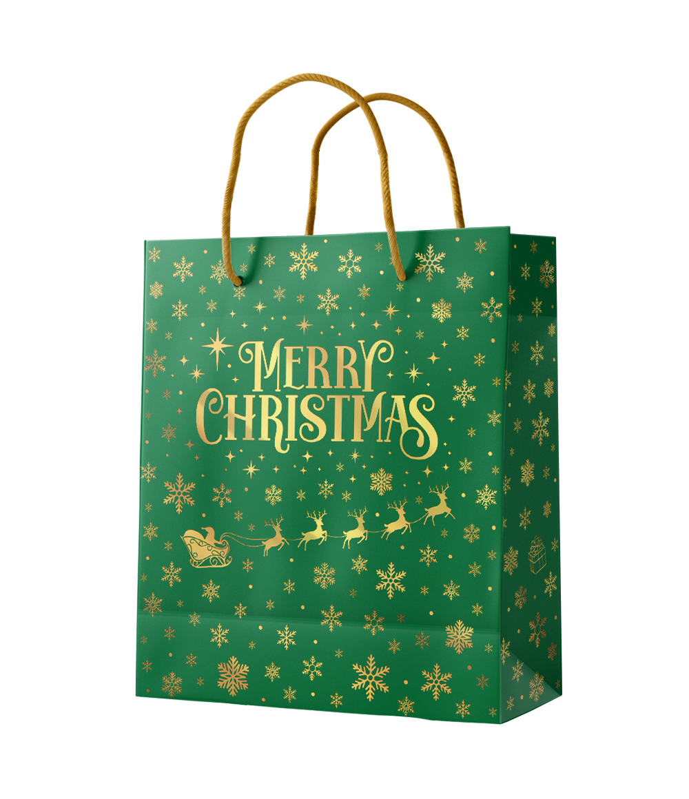 Verleihe deinen Weihnachtsgeschenken einen festlichen Touch mit dieser grünen Geschenktüte Merry Christmas, die mit Golddruck und fröhlichen Weihnachtsmotiven wie Rentieren, Schneeflocken und dem Text Merry Christmasversehen ist. Ideal, um kleine Geschenke, Leckereien oder Überraschungen während der Festtage stilvoll zu verpacken.