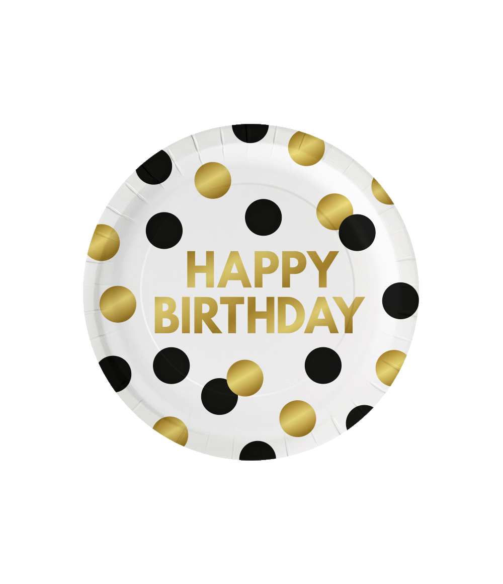 Happy Birthday Teller Schwarz-Gold-Punkte 23cm 8 Stk