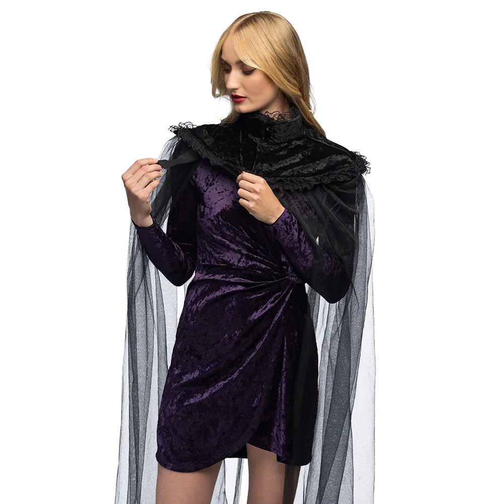 Dieser stilvolle schwarze Umhang ist das i-Tüpfelchen für einen geheimnisvollen und dunklen Look. Der Umhang ist aus leicht durchscheinendem Material gefertigt und hat einen dramatischen hohen Kragen, der mit Spitze verziert ist. Der Umhang ist 170 cm lang und perfekt für ein Halloween- oder Cosplay-Kostüm als Hexe, Vampir oder Schwarze Witwe.
