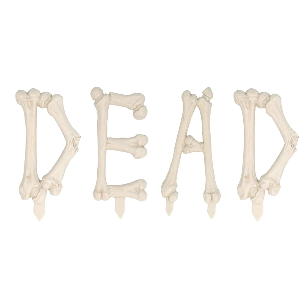 Grabstein-Dekorationsset (3 Grabsteine, 2 Skelettarme, 4 Knochen in Form der Buchstaben DEAD, schwarze Krähe, schwarze Blume, 4 Ratten, 7 Spinnen, blutige Verbände, Spinnweben)