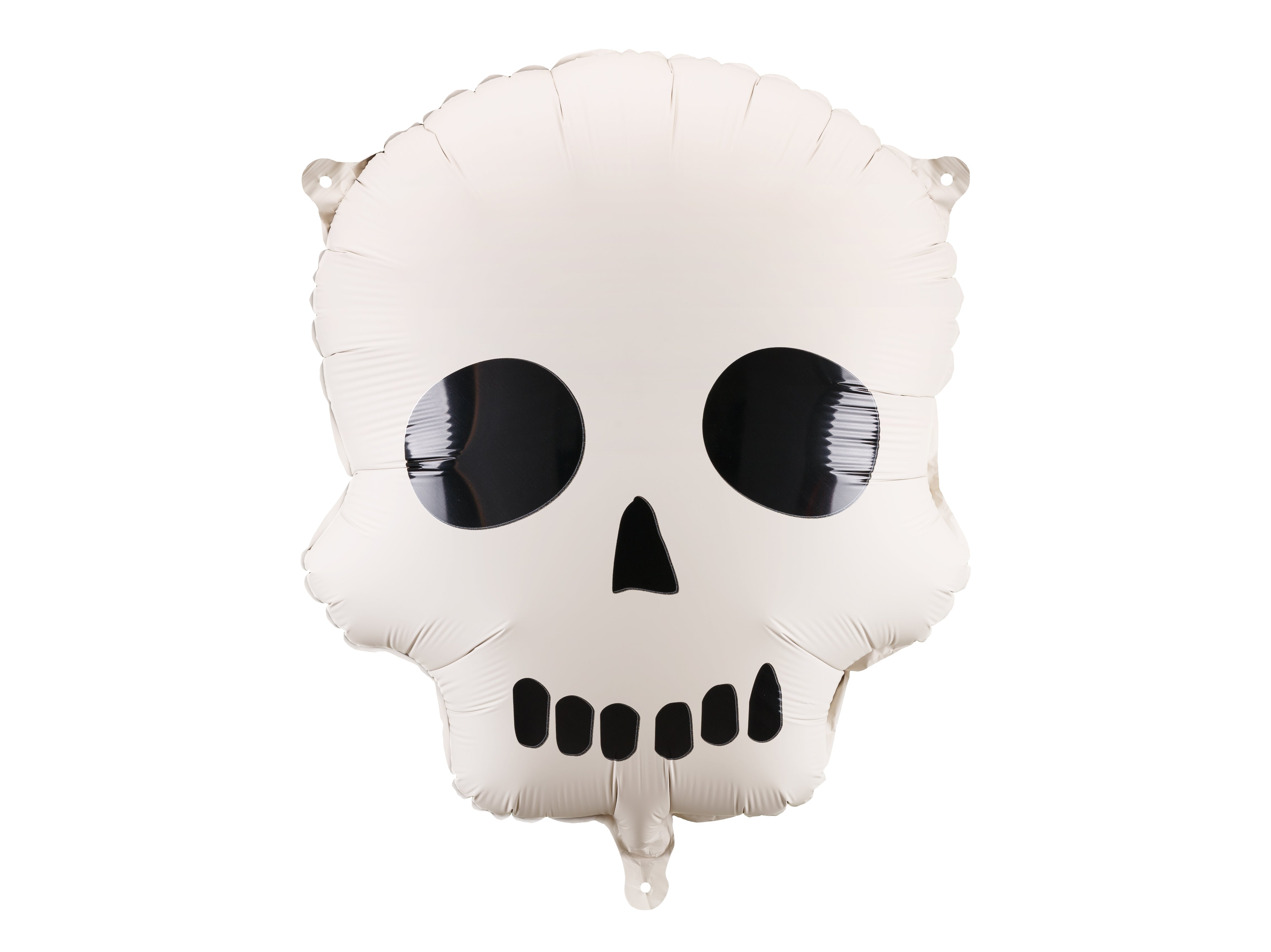 Folienballon Schädel in cremefarben und schwarz. Maße vor dem Aufblasen ca. 45,5 x 52,5 cm (17,9 x 20,7''), Maße nach dem Aufblasen ca. 36 x 41 cm (14,2 x 16,1''). Zum Aufblasen mit Luft und Helium. Das Set enthält einen Strohhalm.