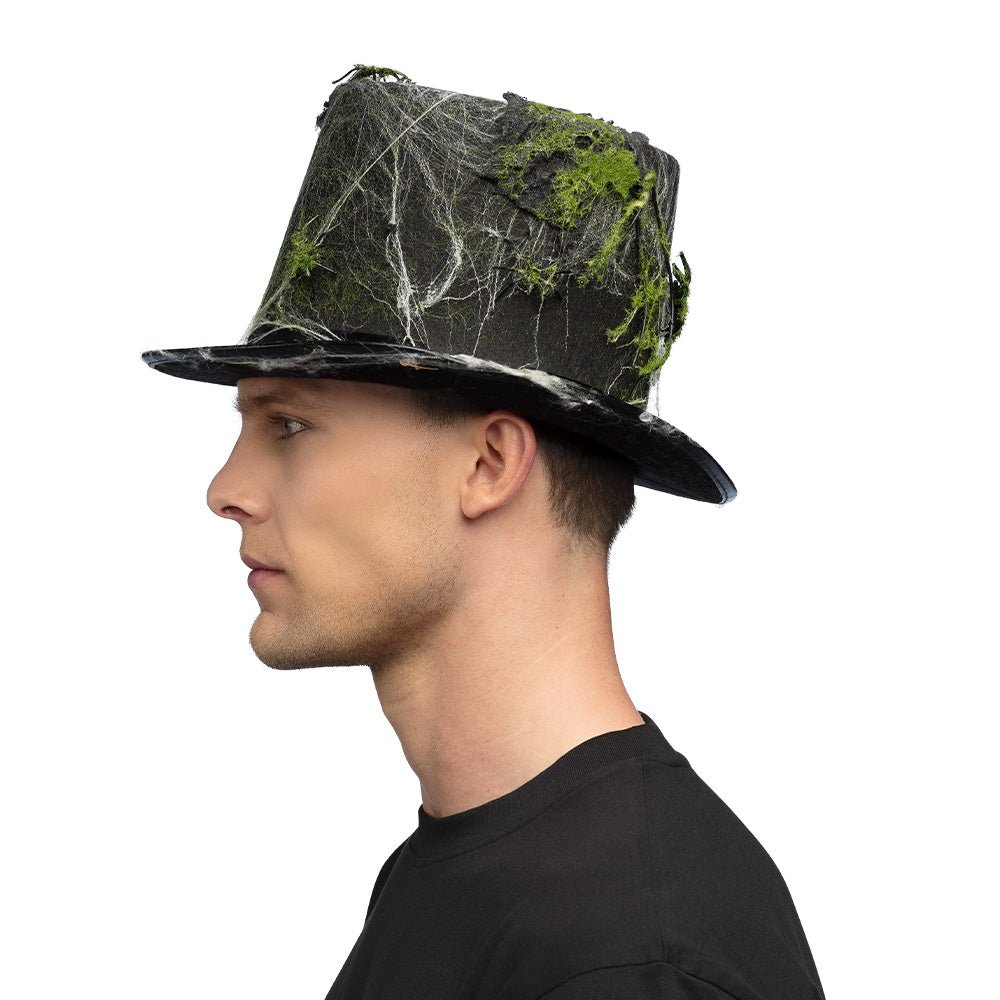 Mit Spinnweben, Moos-Akzenten und einem verwitterten Look sieht dieser Hut aus, als wäre er direkt aus einem gruseligen Sumpf gerupft worden. In Kombination mit einem düsteren Zombiekostüm oder einem gruseligen Magieroutfit sorgt dieser Zylinder für den perfekten finsteren Look. Ein Muss für jede Halloweenparty, Süßes-oder-Saures-Parade oder Spukhaus.