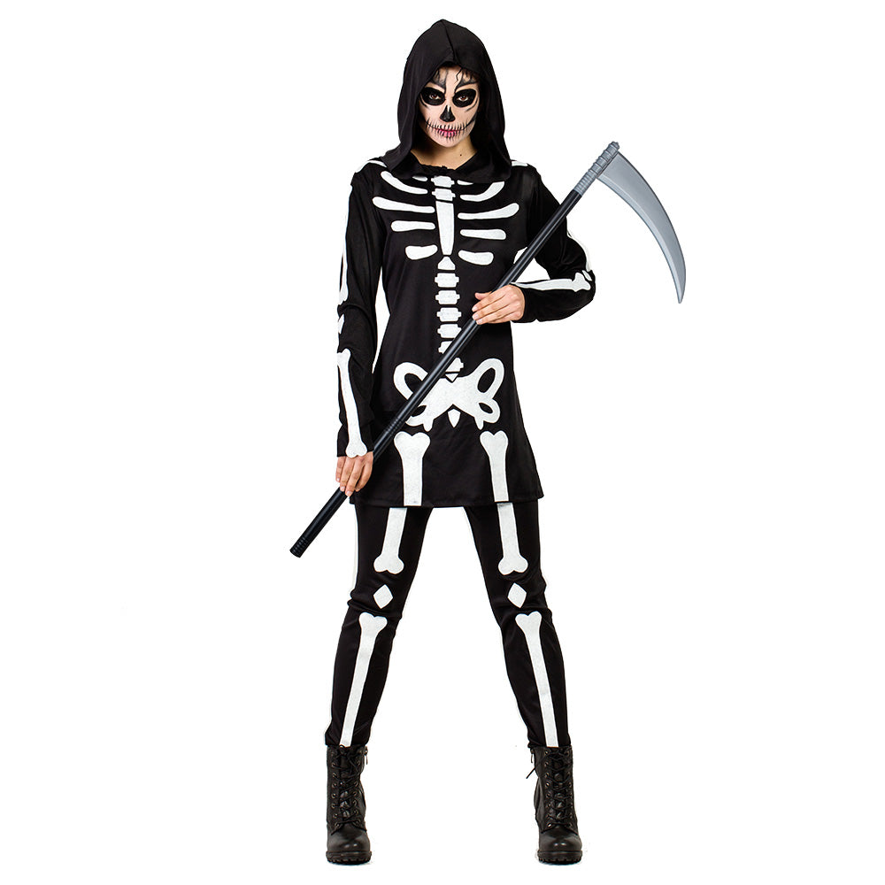 Dieses coole zweiteilige Skelettkostüm für Frauen verwandelt dich in ein furchterregendes Skelett oder einen Sensenmann. Das Halloween-Kostüm, bestehend aus einem bequemen Langarm-Kapuzenpulli und einem Kapuzenpulli mit passenden Leggings, kombiniert perfekt die gruseligen Vibes eines Skeletts mit einem toughen Look. Beide Teile sind mit einem weißen Knochenaufdruck verziert. Mit seiner bequemen Passform und dem gruseligen Look ist dieses Kostüm perfekt für Halloween-Partys, Cosplay und/oder Themenevents und Trick-or-Treat-Nächte.