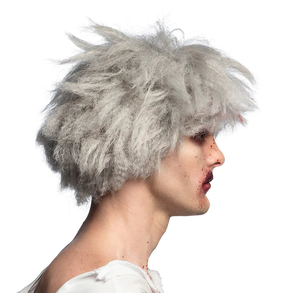 Eine wilde weiße Zombie-Perücke für Männer. Die Perücke hat eine mittellange Waffelfrisur für einen wirren Look, der ein furchterregendes Zombie-Outfit vervollständigt. Das perfekte Accessoire, um als lebender Toter an Halloween allen eine Gänsehaut zu verpassen.