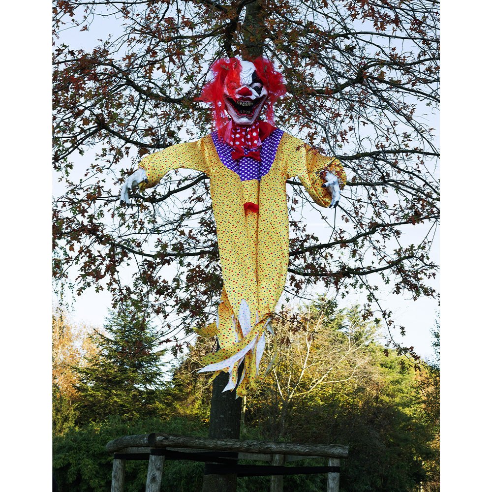 Mach deine Halloween-Party unvergesslich mit dieser riesigen 3,5 Meter großen Clown-Puppe. Mit ihrem knallbunten Outfit, dem furchterregenden Lächeln und den wilden roten Haaren ist diese Horrordekoration ein echter Hingucker. Hänge sie in einen Baum, an die Haustür oder in ein Spukhaus und erschrecke alle zu Tode.