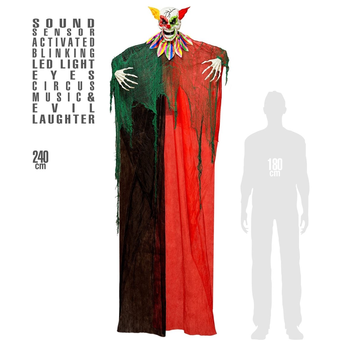 Mach deine Halloween-Party mit dieser 2,4 Meter großen Clown-Puppe unvergesslich. Die Puppe ist mit roten Lichtern und Sound ausgestattet, was sie zu einer furchteinflößenden und auffälligen Dekoration für deine Partylocation, dein Spukhaus oder deinen Themenraum macht.