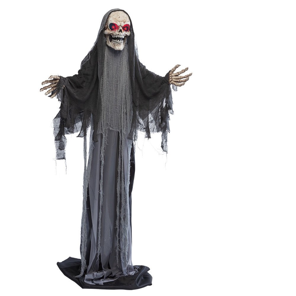 Dieser gruselige Sensenmann ist die perfekte Halloween-Dekoration, um allen eine Gänsehaut zu verpassen. Neben ihrem gruseligen Aussehen und den rot leuchtenden Augen erwacht diese lebensgroße Puppe auch zum Leben, sobald sich etwas in ihrer Nähe bewegt. Einmal aktiviert, sorgt die Sensenmann-Puppe mit ihren schaurigen Geräuschen für Albträume und wächst von 180 cm auf maximal 215 cm, was sie noch furchterregender macht! Eine echte Must-Have-Dekoration für Spukhäuser und Halloween-Events.