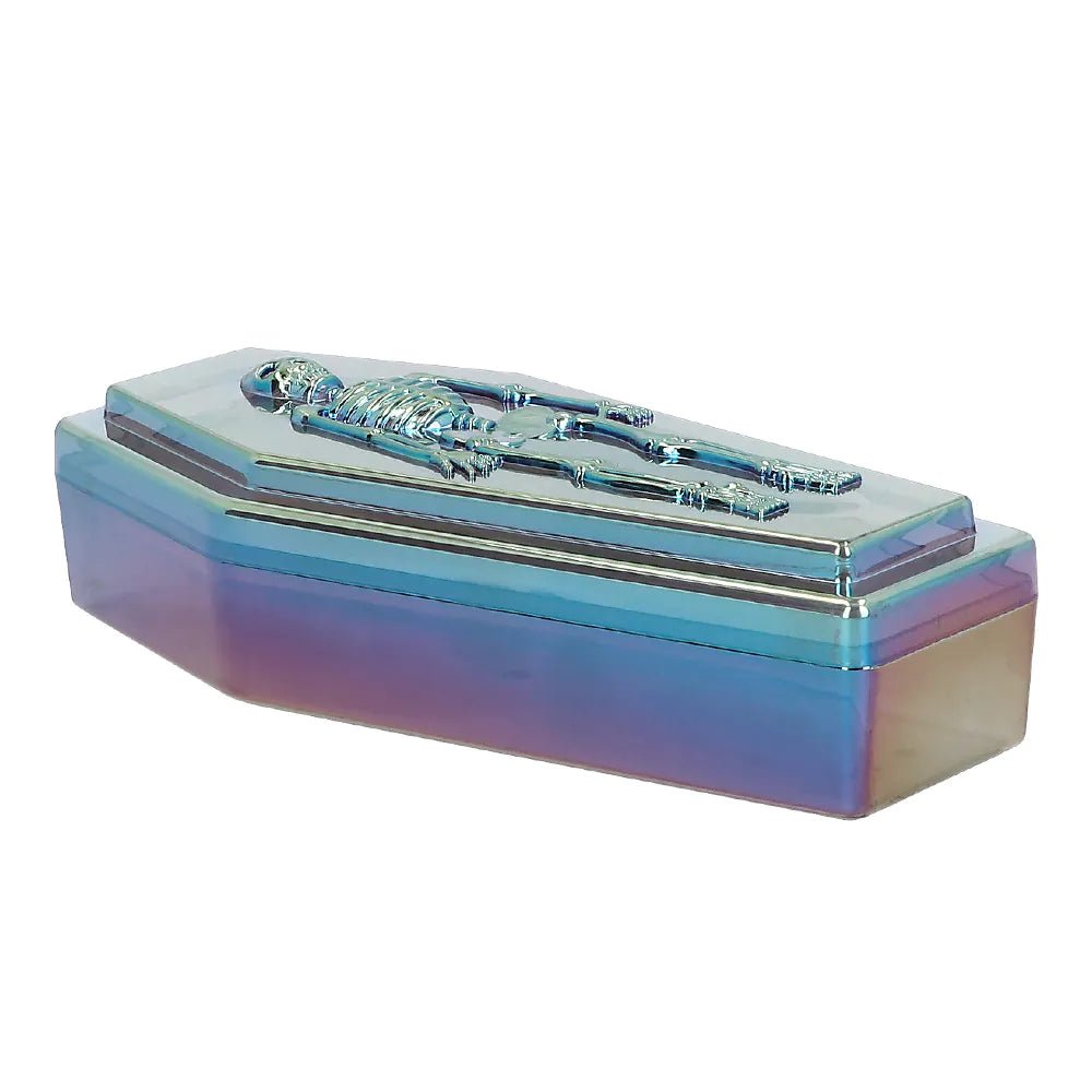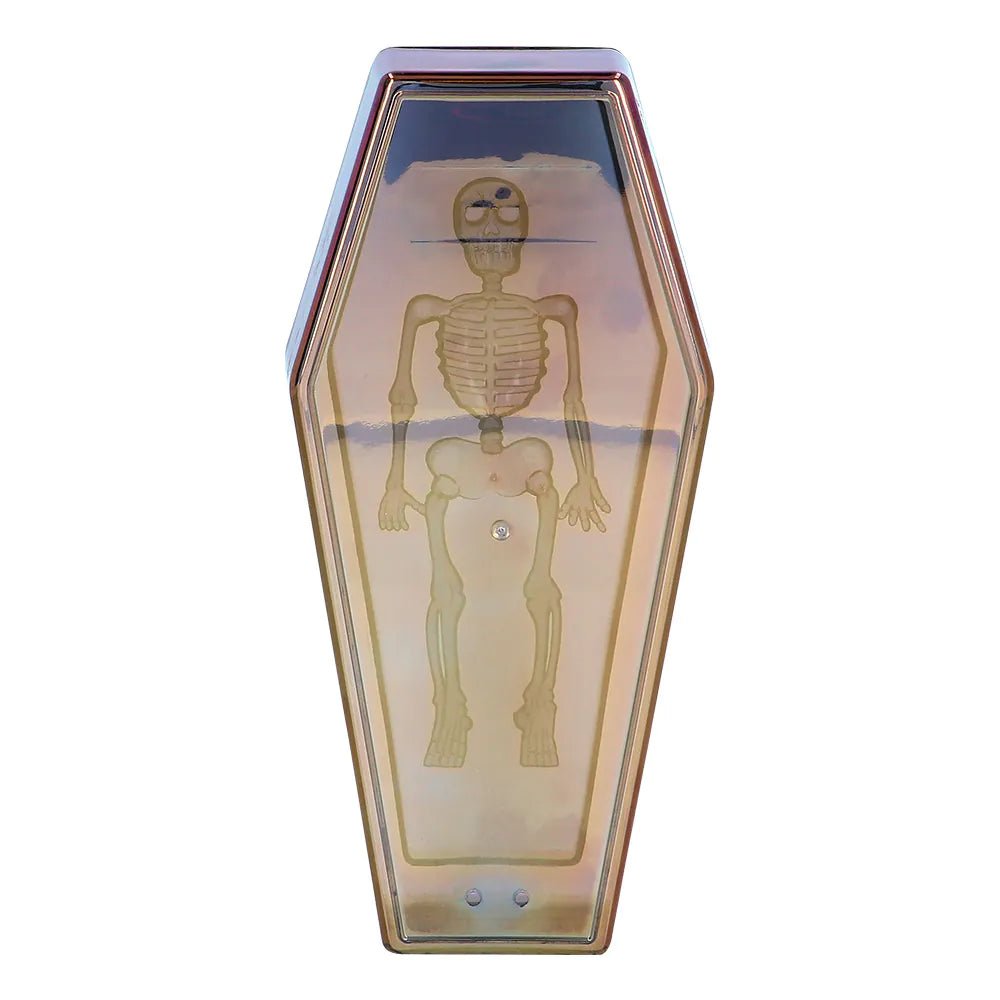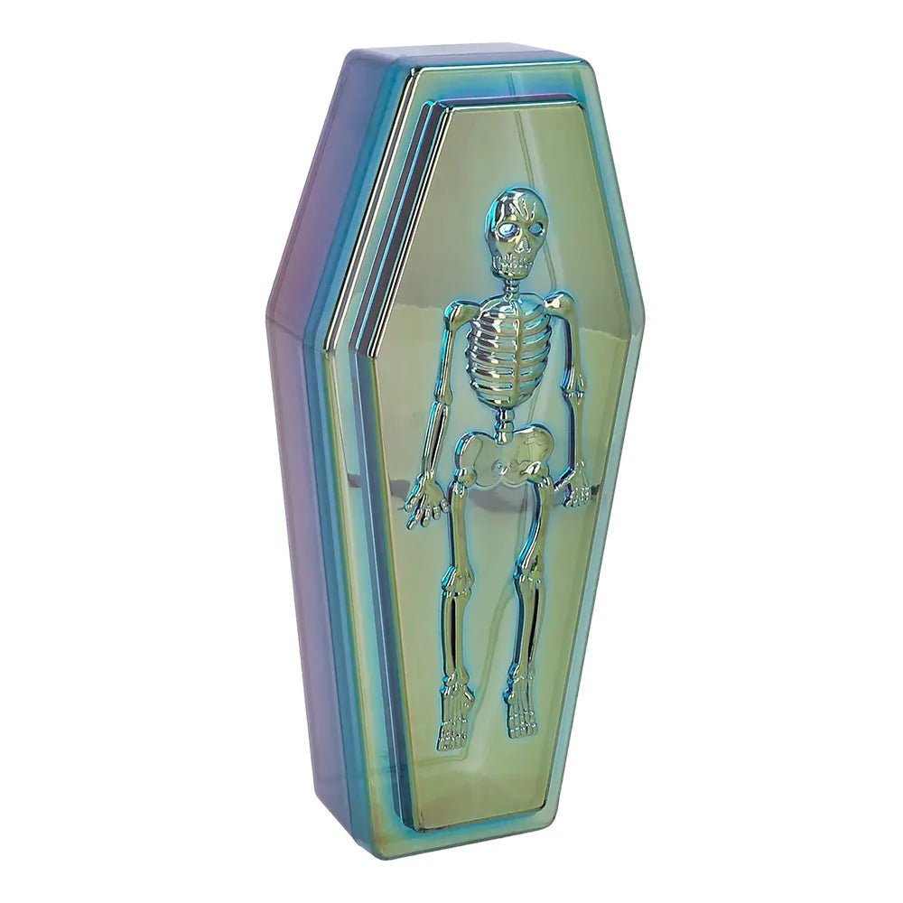 Dieser bunte 19cm-Sarg ist zu cool als Dekoration für eine gruselige Halloween-Party. Die Truhe ist mit dem Relief eines Skeletts verziert, was sie zu einem echten Blickfang macht. Schön zu kombinieren mit ein paar Totenköpfen und Skeletten.