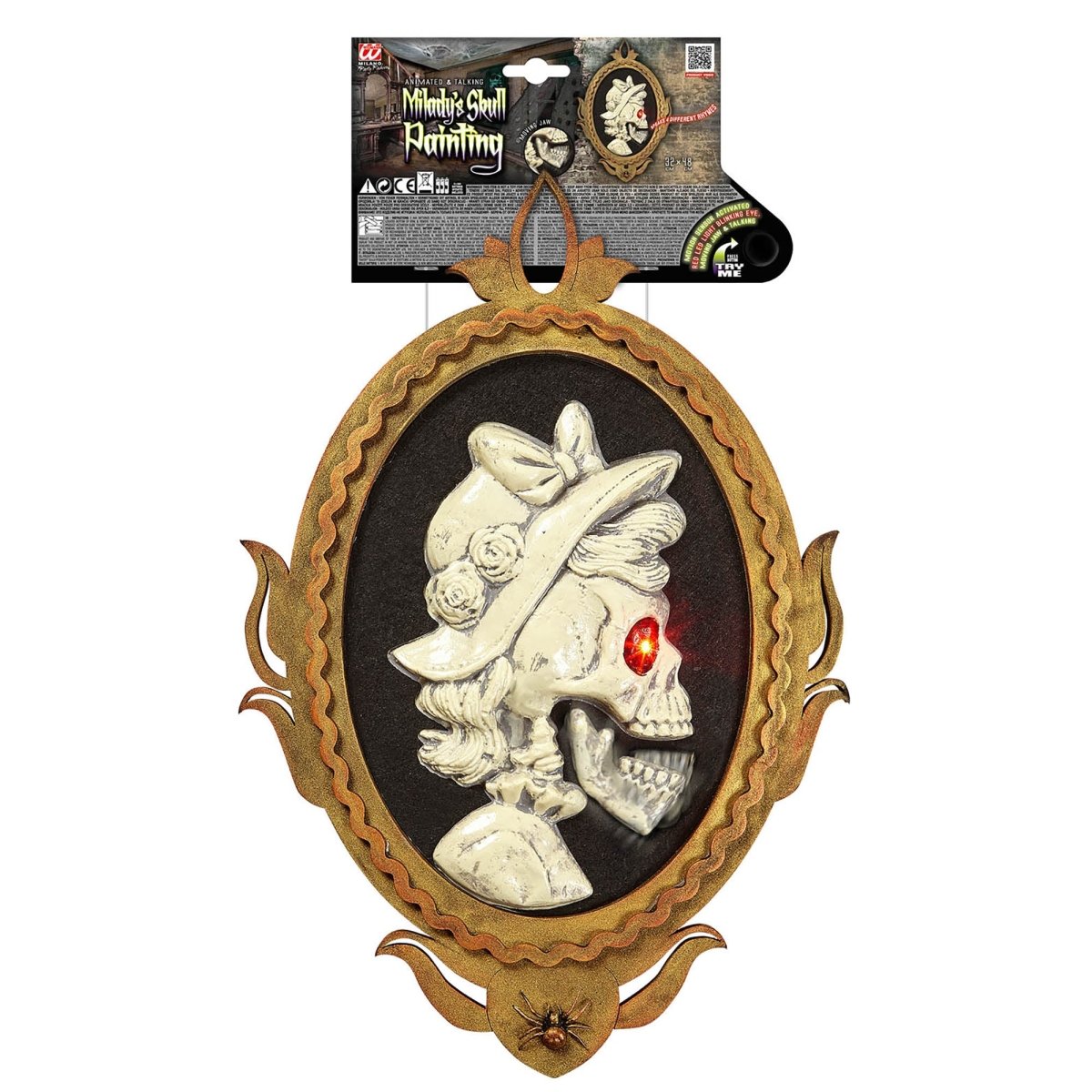 Mach deinen Halloween-Eingang besonders gruselig mit diesem 48 cm großen Skelett-Damen-Türschild. Das Design mit roten Lichtern, einem sich bewegenden Kiefer und Soundeffekten macht deine Tür sofort zu einem gruseligen Blickfang.