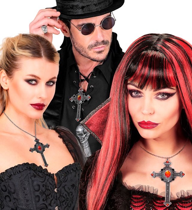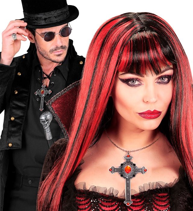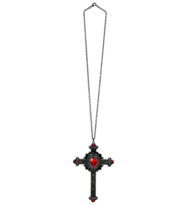 Diese auffällige Kette mit Kreuz und roten Juwelen ist das perfekte Accessoire für Karneval oder Halloween. Ideal, um ein Gothic-, Vampir- oder dunkles Outfit zu vervollständigen.