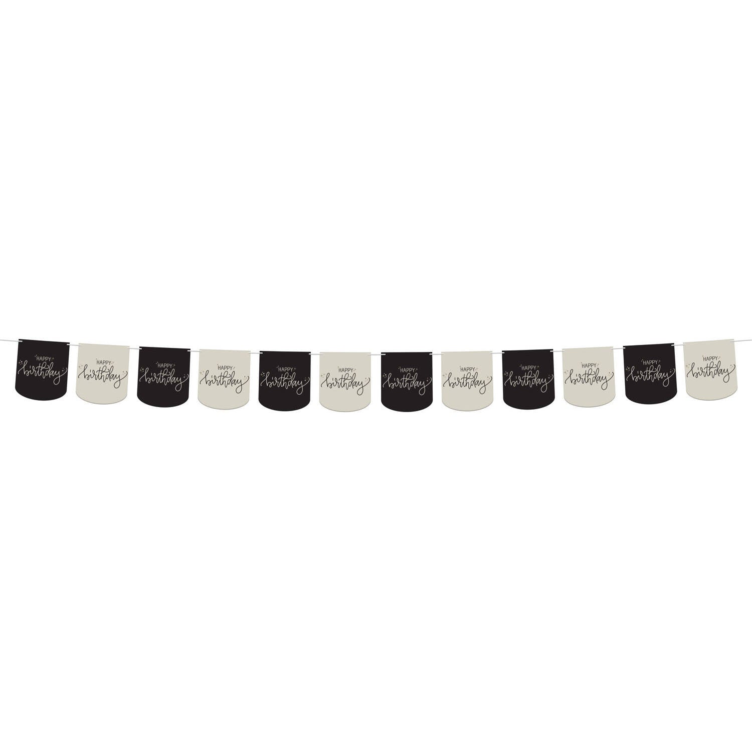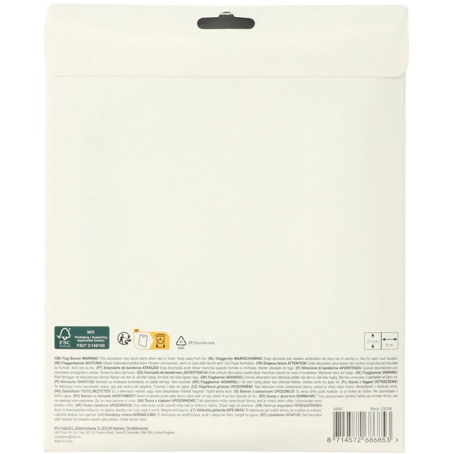 Einfach eine hübsche Fahnenleine. Fahnenleine - Creme Noir - 6 Meter. Inhalt: 1 Fahnenleine. Kann zum Beispiel bei folgenden Partys/Partyanlässen verwendet werden: Geburtstag. Schöne Fahnenleine mit schwarzen und cremefarbenen Fahnen Auf dieser 6 Meter langen Fahnenleine befinden sich 16 Fahnen mit einer Größe von etwa 18 x 21 cm. Auf allen Fahnen steht "HAPPY birthday". Die Fahnen sind auf beiden Seiten bedruckt. Sie können über das weiße Band hin und her geschoben werden. Diese Fahnenleine gehört zu der Crème Noir Kollektion von