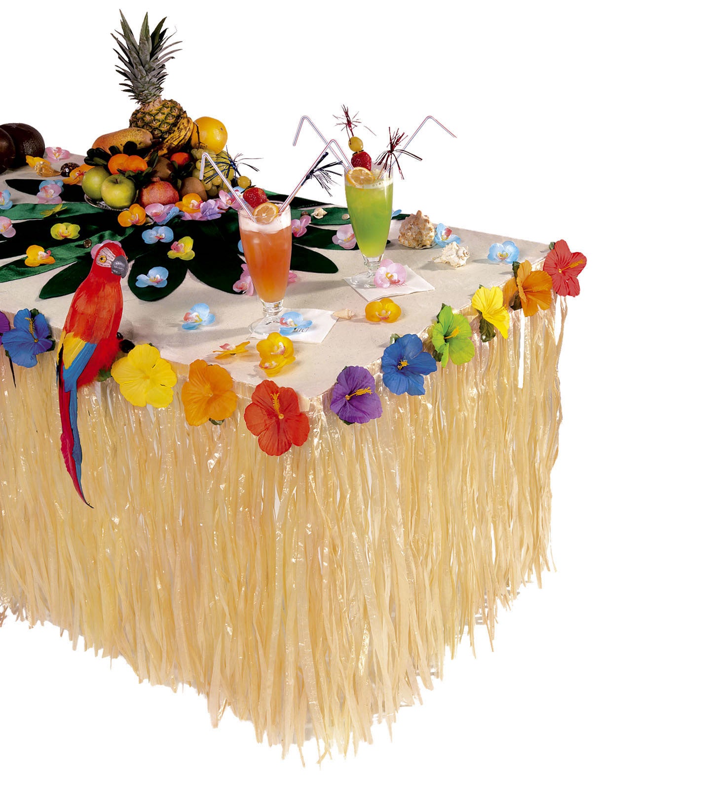 Beschreibung Bewertungen Über dieses Produkt Beschreibung: Tropischer Tischrock mit Hibiskusblüte - 275x75 cmMaterial: Seil: 100% pe - Fransen: 100% Polyesther - Blumen: 100% Polyesther Trustpilot