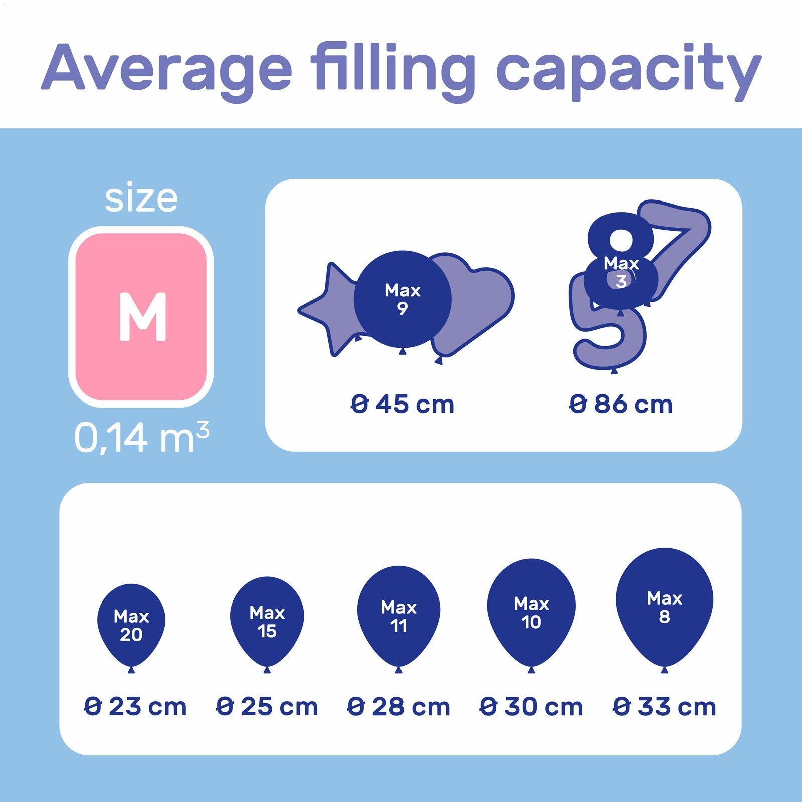 Jeder Zentimeter, den ein Ballon größer ist, beeinflusst seine Kapazität. Die Heliumflaschen basieren auf 25cm-Ballons, wenn du zum Beispiel 30cm-Ballons verwendest, kannst du nur die halbe Menge aus den Heliumflasche herausholen.