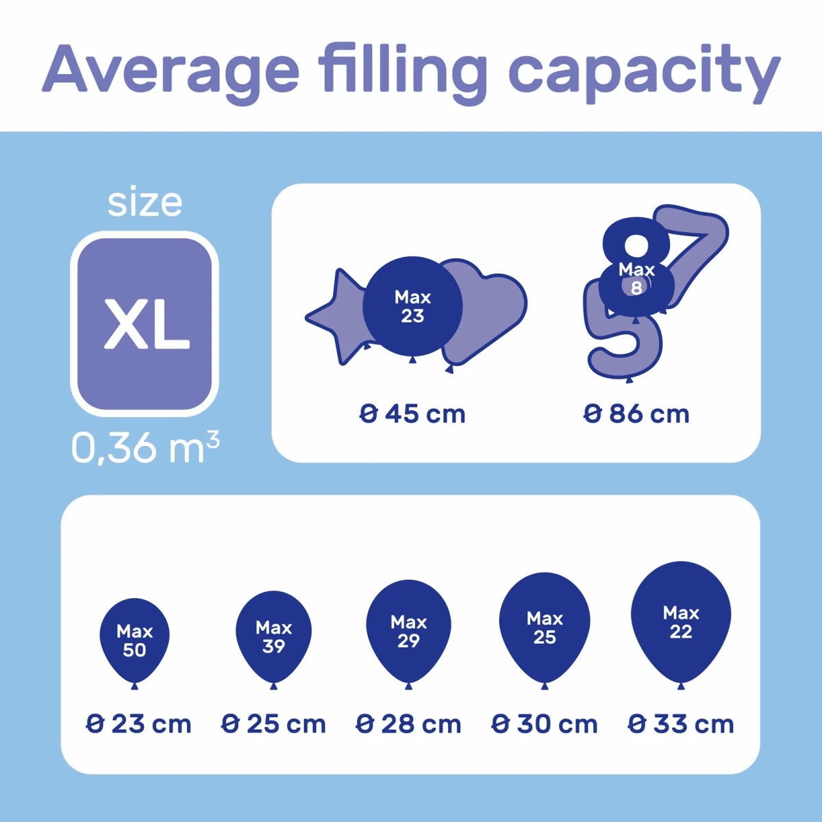 Jeder Zentimeter, den ein Ballon größer ist, beeinflusst sein Fassungsvermögen. Die Heliumflaschen basieren auf 25cm-Ballons, wenn du zum Beispiel 30cm-Ballons verwendest, kannst du nur die halbe Menge aus den Heliumflasche herausholen.