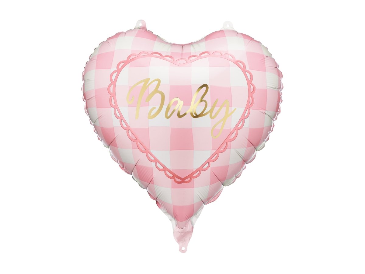 Hellrosa herzförmiger Folienballon mit Rautenmuster und goldener Aufschrift "Baby".Perfekt für Geburtsfeiern und Baby Shower Partys. Er kann sowohl mit Luft als auch mit Helium gefüllt werden. Wird mit einem Strohhalm zum einfachen Aufblasen geliefert