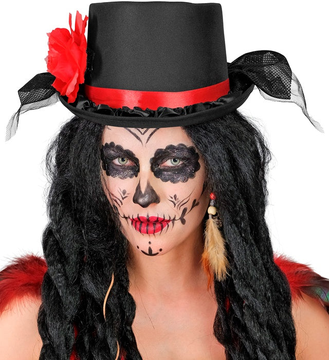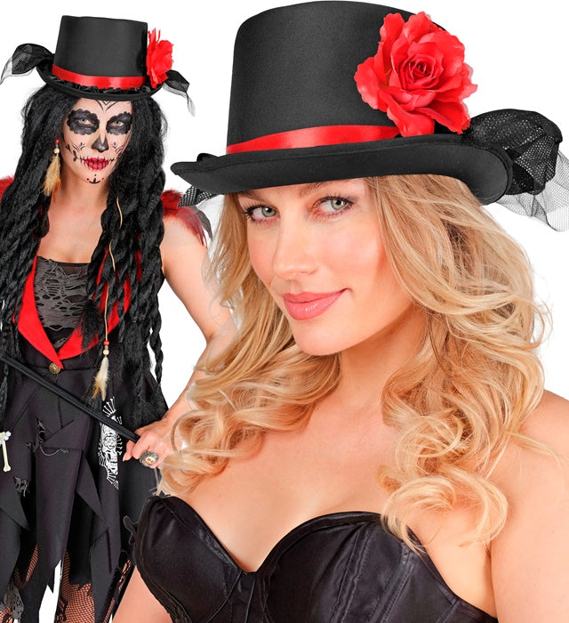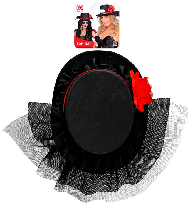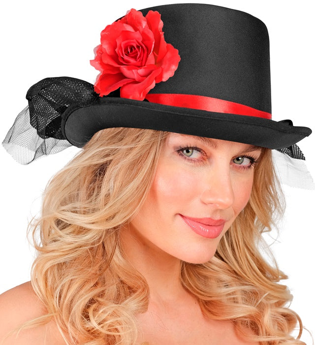 Mach jedes Outfit dramatisch und stilvoll mit diesem hohen schwarzen Hut, der mit Tüll und einer auffälligen roten Rose verziert ist, perfekt für Kostümpartys, thematische Veranstaltungen oder Halloween.