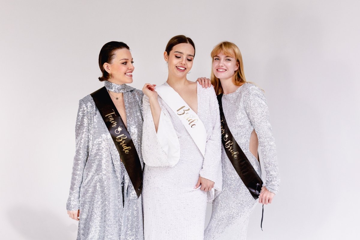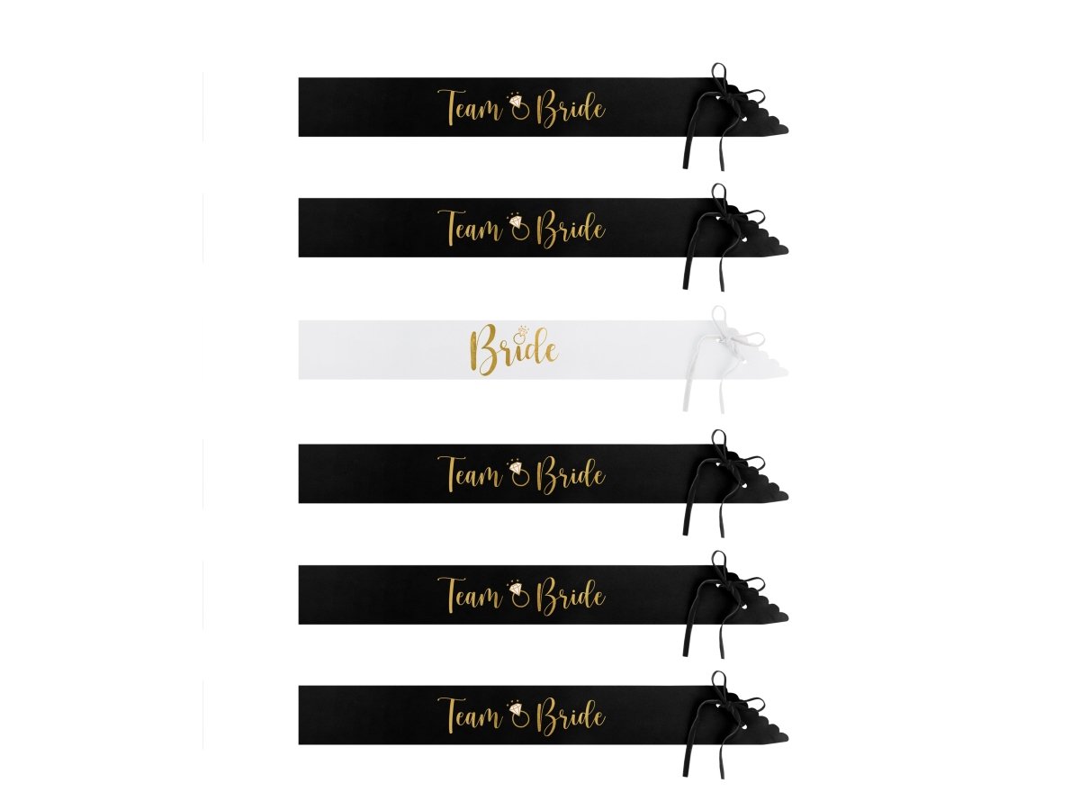 Beschreibung Bewertungen Über dieses Produkt Set mit Satinschärpen. 1 Stück Bride to be in Weiß mit Metallic-Golddruck, 5 Stück Team Bride-Schärpen in Schwarz mit Metallic-Golddruck, Breite ca. 10 cm, Länge ca. 75 cm. Trustpilot