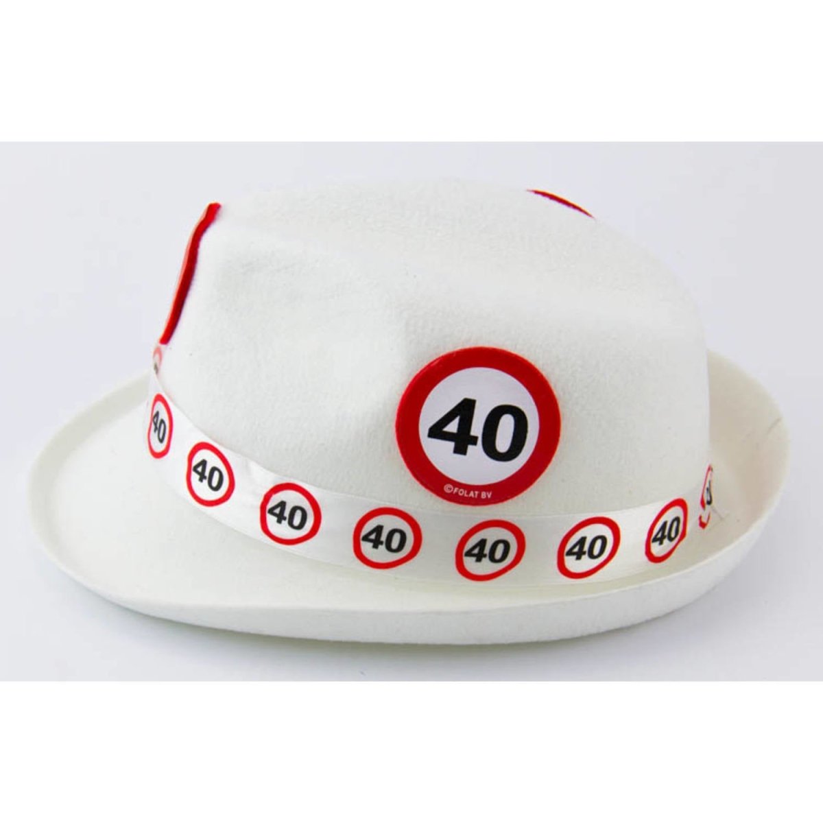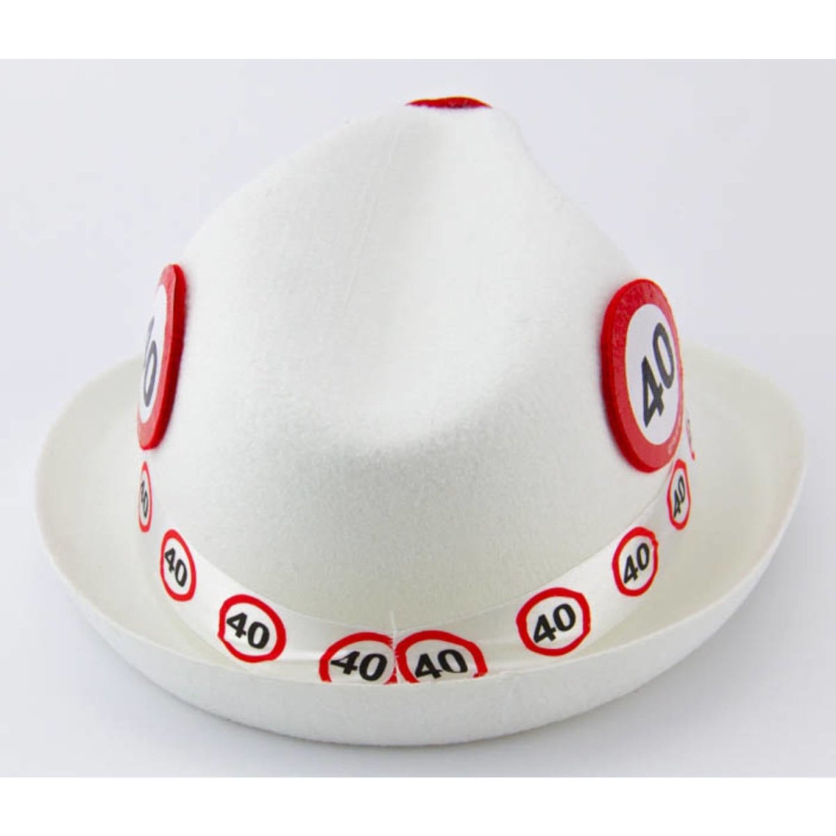 40 Years Traffic Sign White Trilby Hat. Inhalt: 1 Hut, Farbe: Weiß. Zum Beispiel für die folgenden Anlässe zu verwenden: Karneval, Mottoparty, Halloween. Dieser Hut ist 23 cm breit und 37 cm hoch. Der Artikel ist aus Polyester hergestellt.