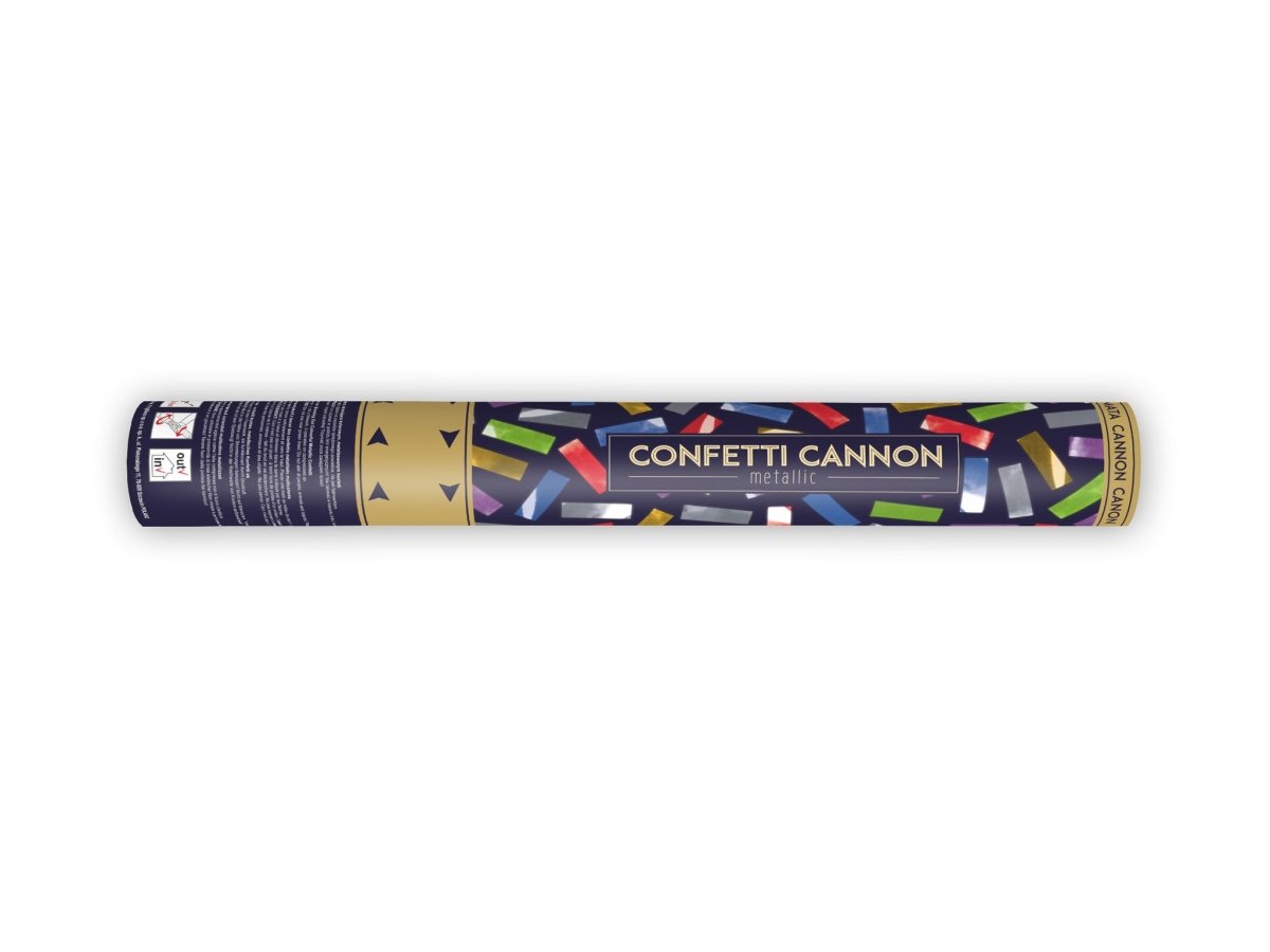 Inhalt: Konfettikanone aus Metallkonfetti schießend, Länge 40 cm.
