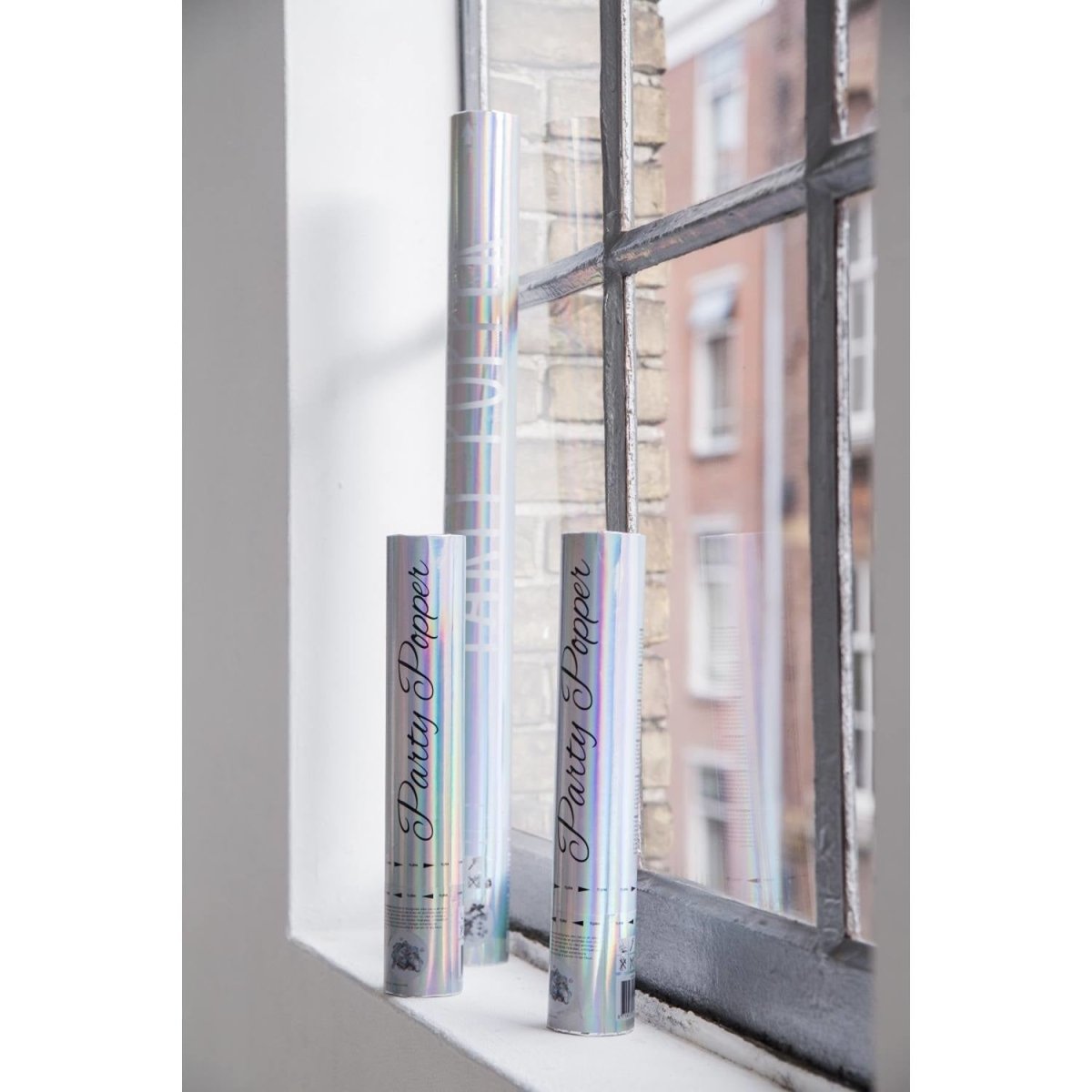 Konfettikanone Silber - 28cm. Inhalt: 1 Konfettikanone. Farbe: Silber. Zum Beispiel zur Verwendung bei folgenden Anlässen: Geburtstag, Kinderfest und Jubiläum. Der Artikel ist 28 cm lang. Der Artikel ist aus Kunststoff hergestellt.