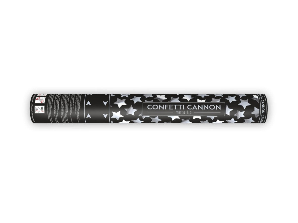 Inhalt: Konfettikanone, die metallische Sterne abschießt, silber, Länge 40 Zentimeter.