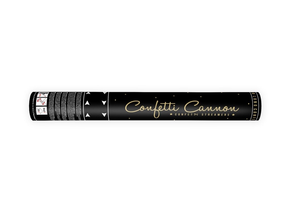 Inhalt: Konfettikanone, die lange goldene metallische Luftschlangen abschießt, Länge 40cm.