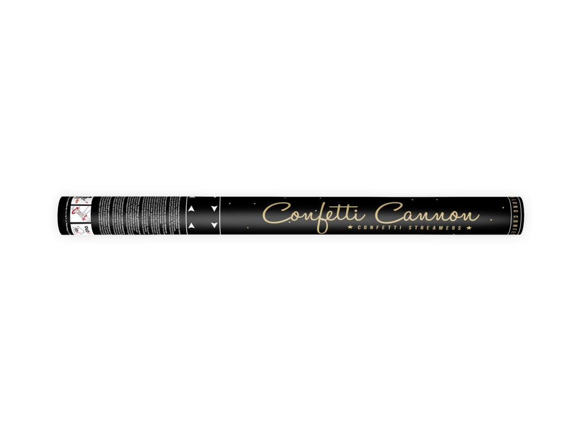 Inhalt: Konfettikanone, die lange goldene metallische Luftschlangen abschießt, Länge 60 cm.