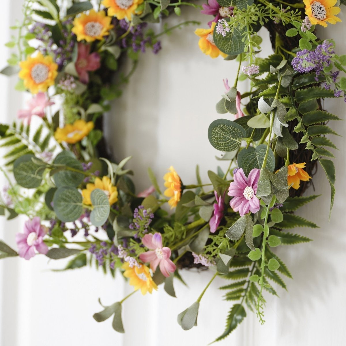 Dieser dekorative Frühlingskranz zeigt kleine gelbe und rosa Gänseblümchen, Lavendel und einen schönen Hauch von Farn, Efeu und salbeigrünen Blättern.