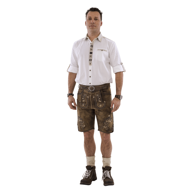 Diese traditionelle kurze Lederhose verbindet Handwerkskunst mit Stil dank der exklusiven Stickerei und dem passenden Gürtel. Perfekt für Oktoberfeste, Mottopartys und authentische Anlässe.