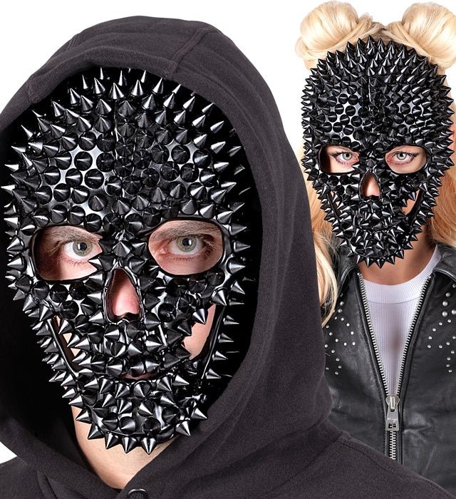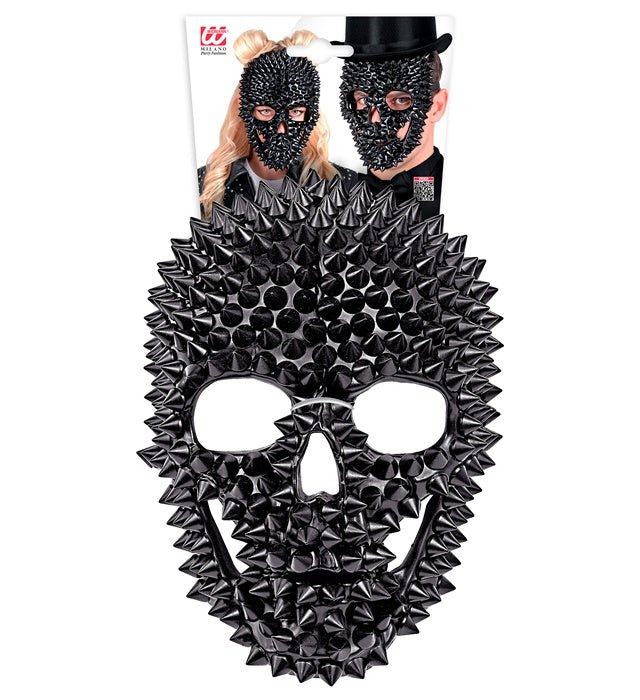 Verleihe deinem Halloween- oder Kostüm-Outfit einen kantigen und gruseligen Look mit dieser schwarzen Totenkopfmaske, die mit Stacheln versehen ist. Perfekt für Mottopartys, Horrorkostüme oder Cosplay.