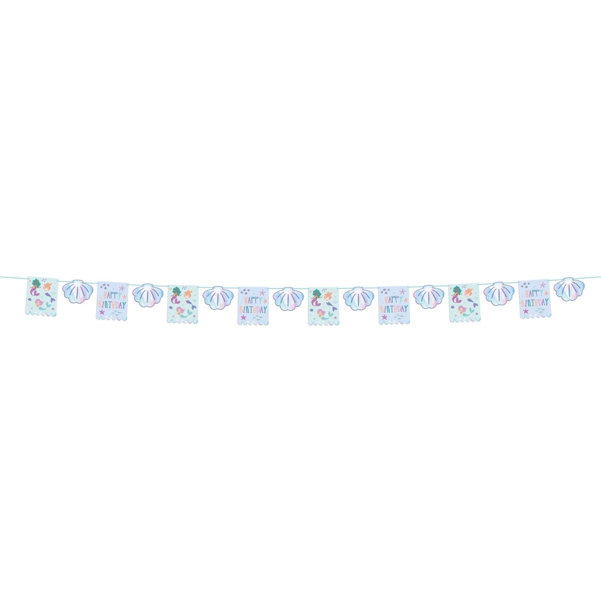 Eine schimmernde Unterwasserwelt. Fahnenleine - Mermaid Magic - 6 Meter. Inhalt: 1 Fahnenleine. Kann zum Beispiel bei folgenden Partys/Partyanlässen verwendet werden: Kinderfest, Geburtstag. Mit dieser Flaggenleine wird es eine echte Meerjungfrauenparty. Auf dieser 6 Meter langen Flaggenleine befinden sich 16 Flaggen mit einer Größe von etwa 17 x 21 cm. Es gibt 3 Arten von Fahnen: eine mintgrüne mit 3 Meerjungfrauen darauf und einem irisierenden Wellenrand, eine paarige/blaue mit dem Text "HAPPY BIRTHDAY" darauf und einem irisierenden Wellenrand und eine voll irisierende Fahne in Form einer Muschel für den zusätzlichen Unterwasser-Glanz. Dank der verwendeten Heißprägetechnik funkeln die irisierenden Teile wirklich! Die Fahnen sind beidseitig bedruckt. Sie können über das türkisfarbene Band hin und her geschoben werden. Diese Flaggenlinie gehört zur Mermaid Magic Kollektion von