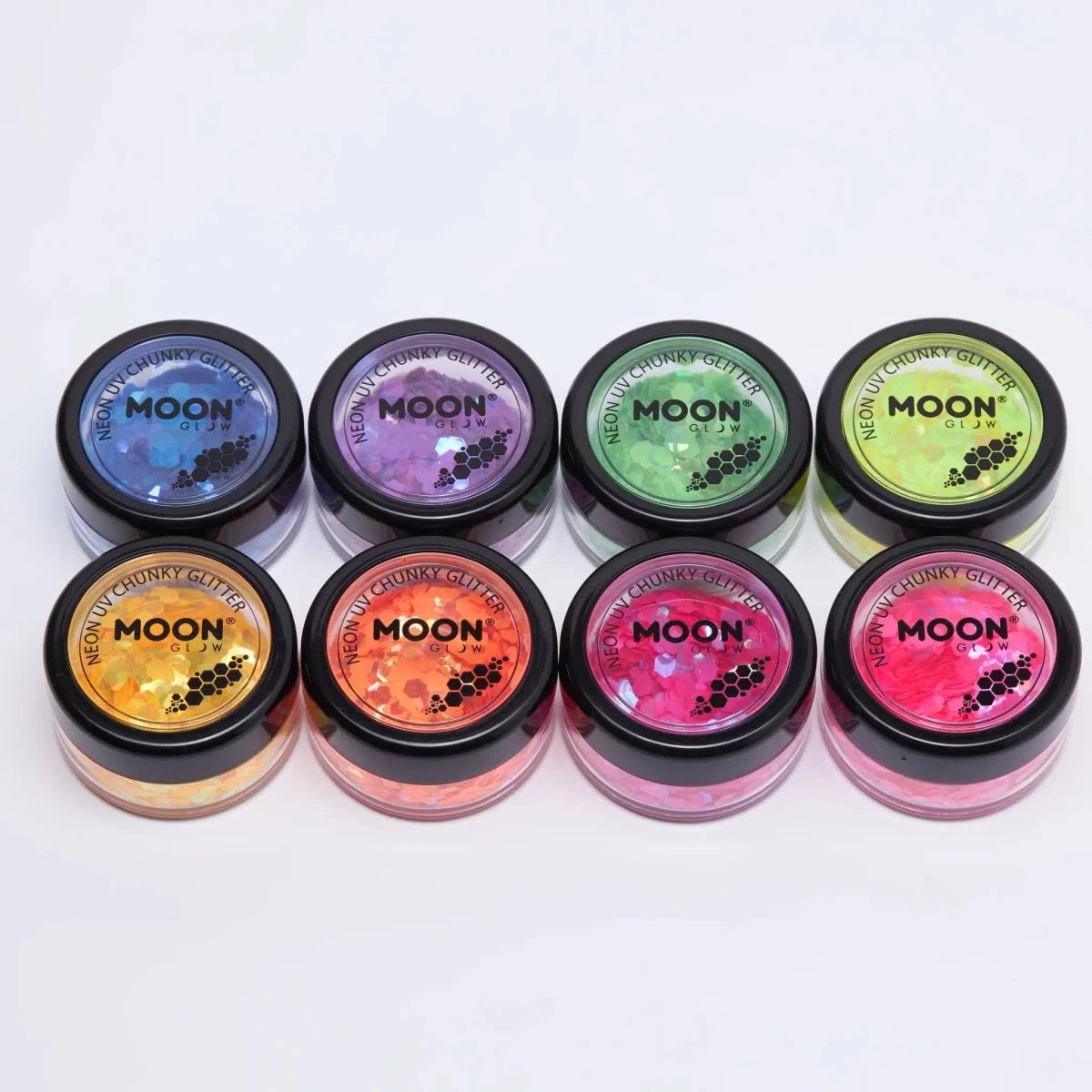 Moon Glow Intense Neon UV Chunky Glitters sind ein Must-have für auffällige Looks, die tagsüber neonfarben leuchten und nachts unter UV-Licht oder Schwarzlicht glühen. Wo immer du bist - ihre Starqualität stiehlt dir die Show!