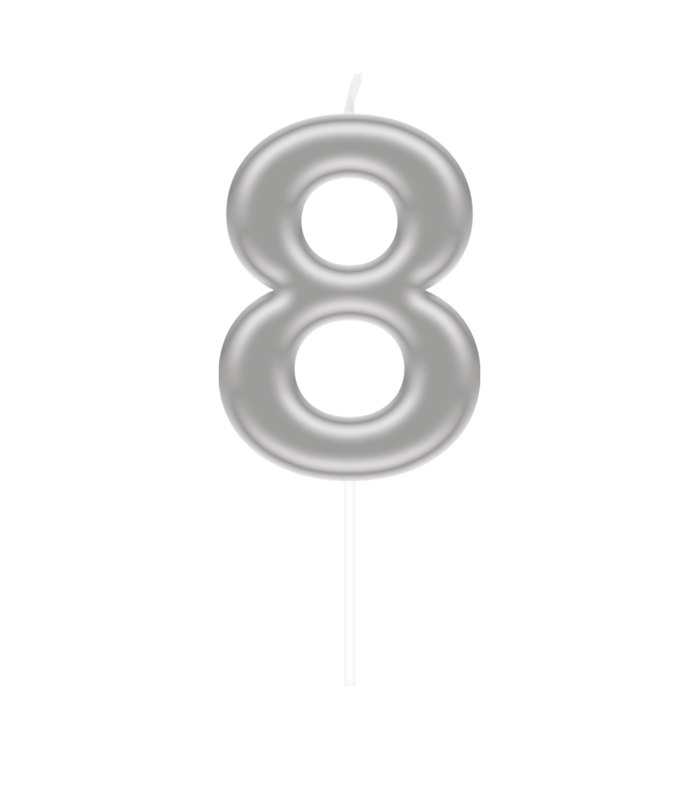 Feiere jeden Meilenstein stilvoll mit dieser silbernen Zahlenkerze "8". Sie eignet sich perfekt zum Markieren von Altersstufen, Jahrestagen oder anderen besonderen Anlässen. Die glänzende silberne Farbe lässt die Kerze auf jedem Kuchen oder Cupcake hervorstechen.