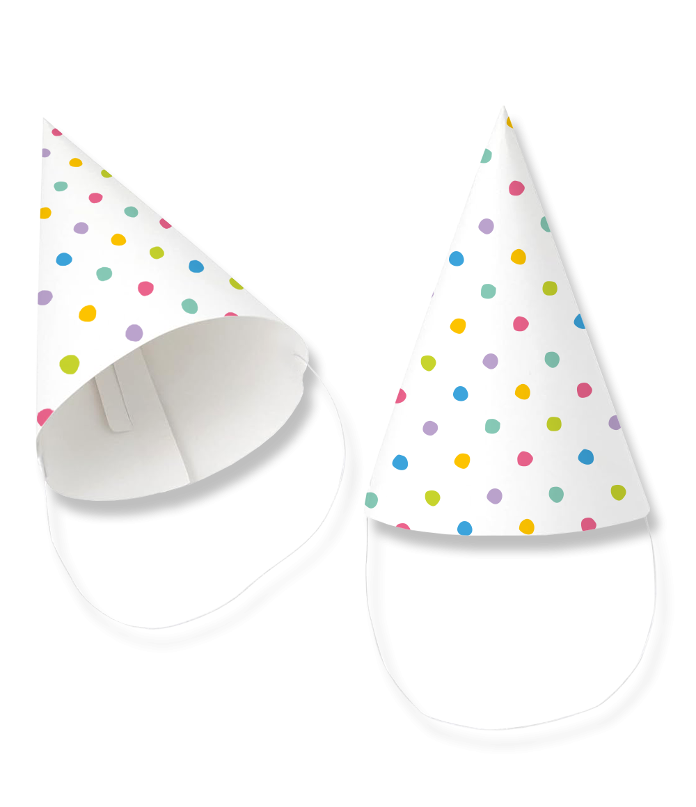 Mit diesen fröhlichen Papierhüten - Party Dots fängt jede Party sofort an zu brodeln! Der farbenfrohe Tupfenaufdruck verleiht den Hüten einen verspielten, sommerlichen Look, der sich perfekt für Kinderpartys, Geburtstage und fröhliche Mottopartys eignet.