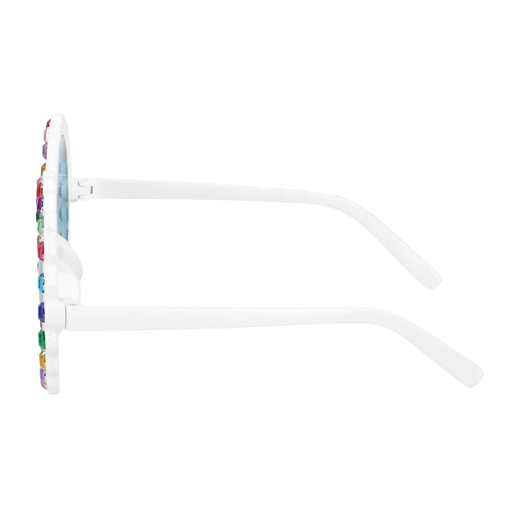 Stiehl die Show mit dieser glamourösen und fröhlichen Brille! Der weiße Rahmen, die großen runden Gläser und die funkelnden regenbogenfarbenen Edelsteine rundherum machen dieses Accessoire zu einem farbenfrohen Hingucker auf der Pride, einem Festival oder einer Hippie-Motto-Party.